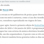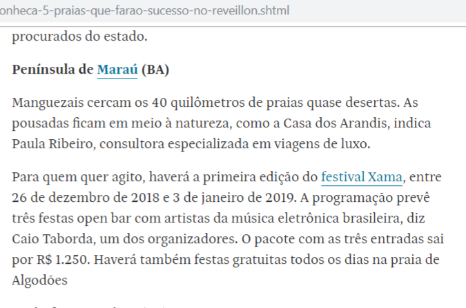 O conceituado Jornal Folha de São Paulo, listou as cinco praias que farão sucesso neste réveillon. Na lista, praias famosas como a de Touros, no Rio Grande do Norte, Praia dos Carneiros em Pernambuco e é claro a Península de Maraú, com destaque para a praia de Algodões, que receberá o festival Xama 2019.
