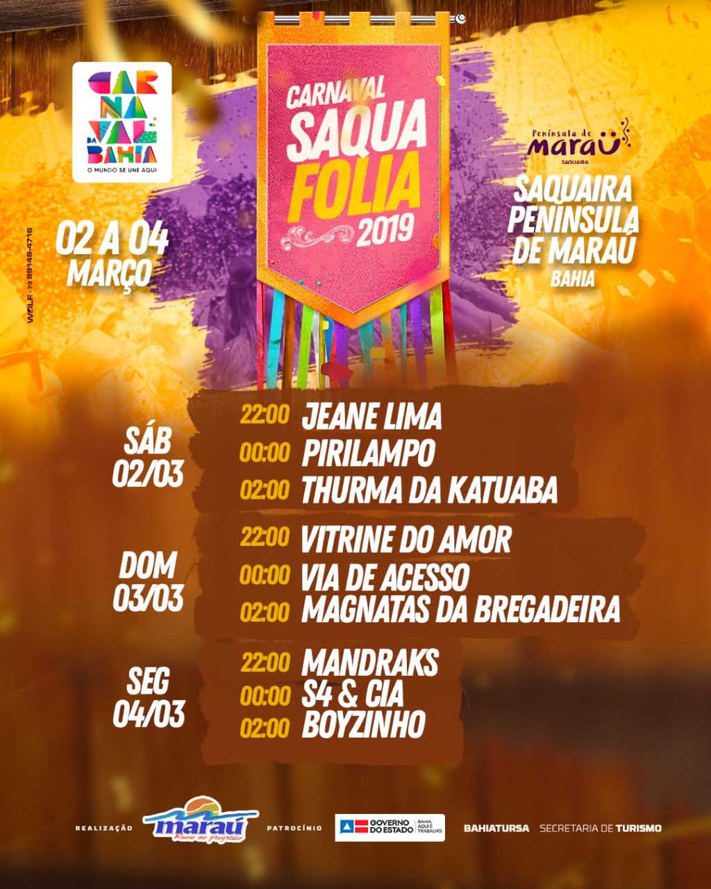 O Saquafolia como é carinhosamente chamado, vai acontecer de 2 a 4 de março. Uma mega estrutura já está sendo montada na praia de Saquaíra pela Prefeitura de Maraú, para receber turistas e moradores que irão curtir os três dias de festa. A polícia militar vai fazer a segurança do evento com 25 policiais dentro e fora do circuito da folia.