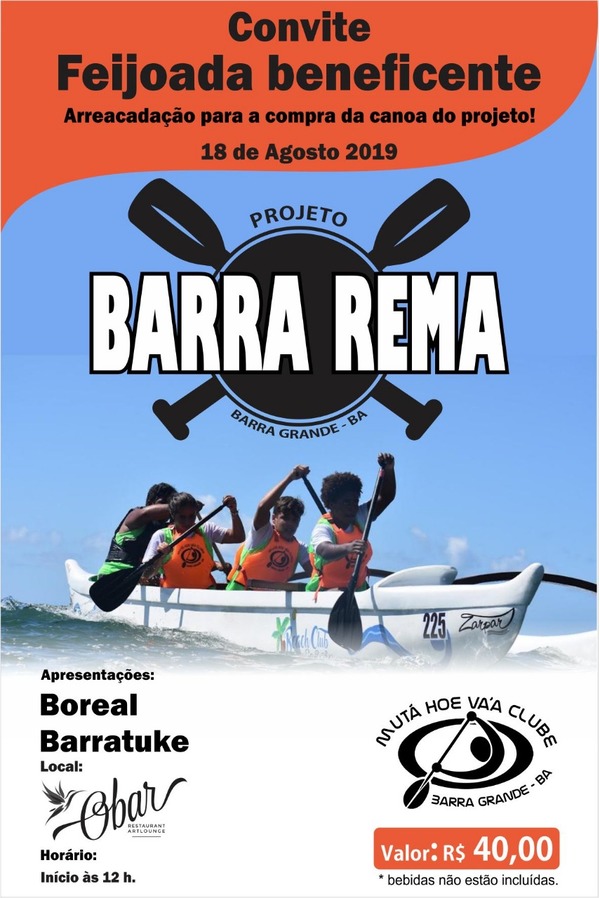 A 1º Feijoada Beneficente oferecida pelo Mutá Hoe Va’a Clube, será realizada no domingo (18) de Agosto. O evento visa buscar recursos para a aquisição de mais uma canoa para o Barra Rema, projeto que promove e incentiva a prática do remo para as crianças das escolas públicas, em Barra Grande, na Península de Maraú.