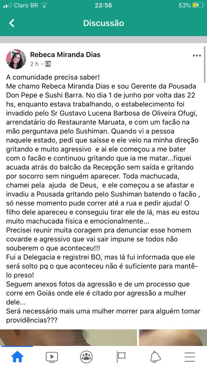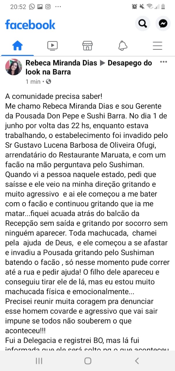De acordo com Rebeca, ela ficou acuada atrás do balcão da recepção, sem saída e gritando por socorro toda machucada, clamando por ajuda de Deus. O agressor então invadiu a pousada Don Pepe que fica ao lado do restaurante, gritando atrás do sushiman batendo com facão pelos objetos. A vítima conseguiu correr e chamar por socorro. O filho do agressor apareceu no local e conseguiu tirar o pai do restaurante.