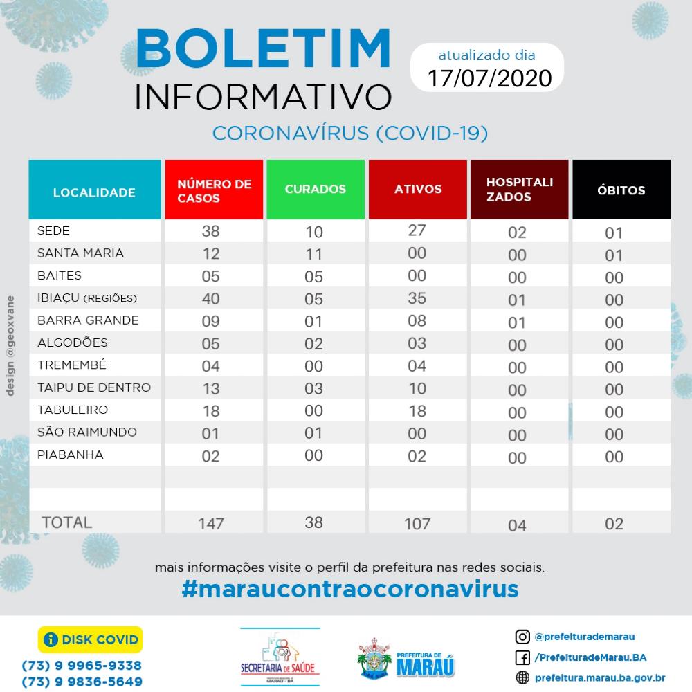 Até a presente data, Maraú contabiliza, 147 casos confirmados, 38 pacientes curados, 107 ativos, 02 óbitos, 99 suspeitos, 99 aguardando resultado e 81 casos negativos. Disk Covid (73) 9 9965-9338 – (73) 9 9836-5649.