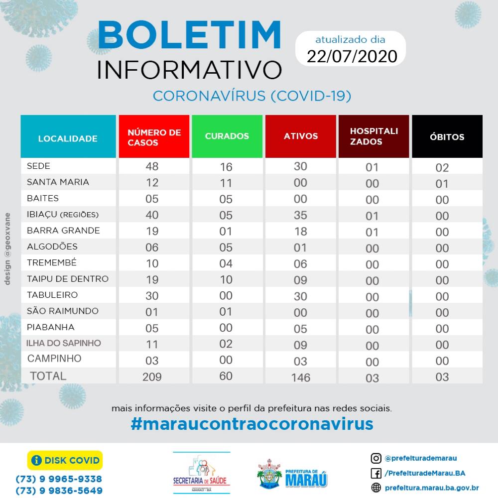 Até a presente data, Maraú contabiliza, 209 casos confirmados, 60 pacientes curados, 146 ativos, 03 óbitos, 66 suspeitos, 66 aguardando resultado e 114 casos negativos. Disk Covid (73) 9 9965-9338 – (73) 9 9836-5649.