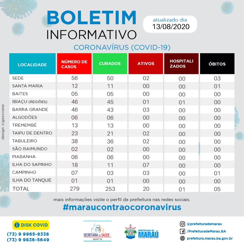 Até a presente data, Maraú contabiliza, 279 casos confirmados, 253 pacientes recuperados, 20 ativos, 05 óbitos, 21 suspeitos, 21 aguardando resultado e 225 casos negativos. Disk Covid (73) 9 9965-9338 – (73) 9 9836-5649.