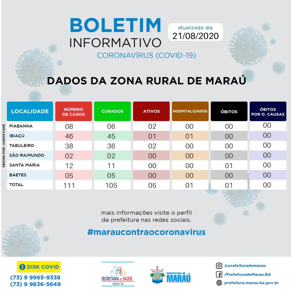 Maraú tem 01 óbito por outras causas, já que um paciente infectado com a COVID-19, morreu em decorrência de outra patologia.Até a presente data, Maraú contabiliza, 291 casos confirmados, 270 pacientes recuperados, 15 ativos, 05 óbitos, 30 suspeitos, 30 aguardando resultado e 240 casos negativos. Disk Covid (73) 9 9965-9338 – (73) 9 9836-5649.