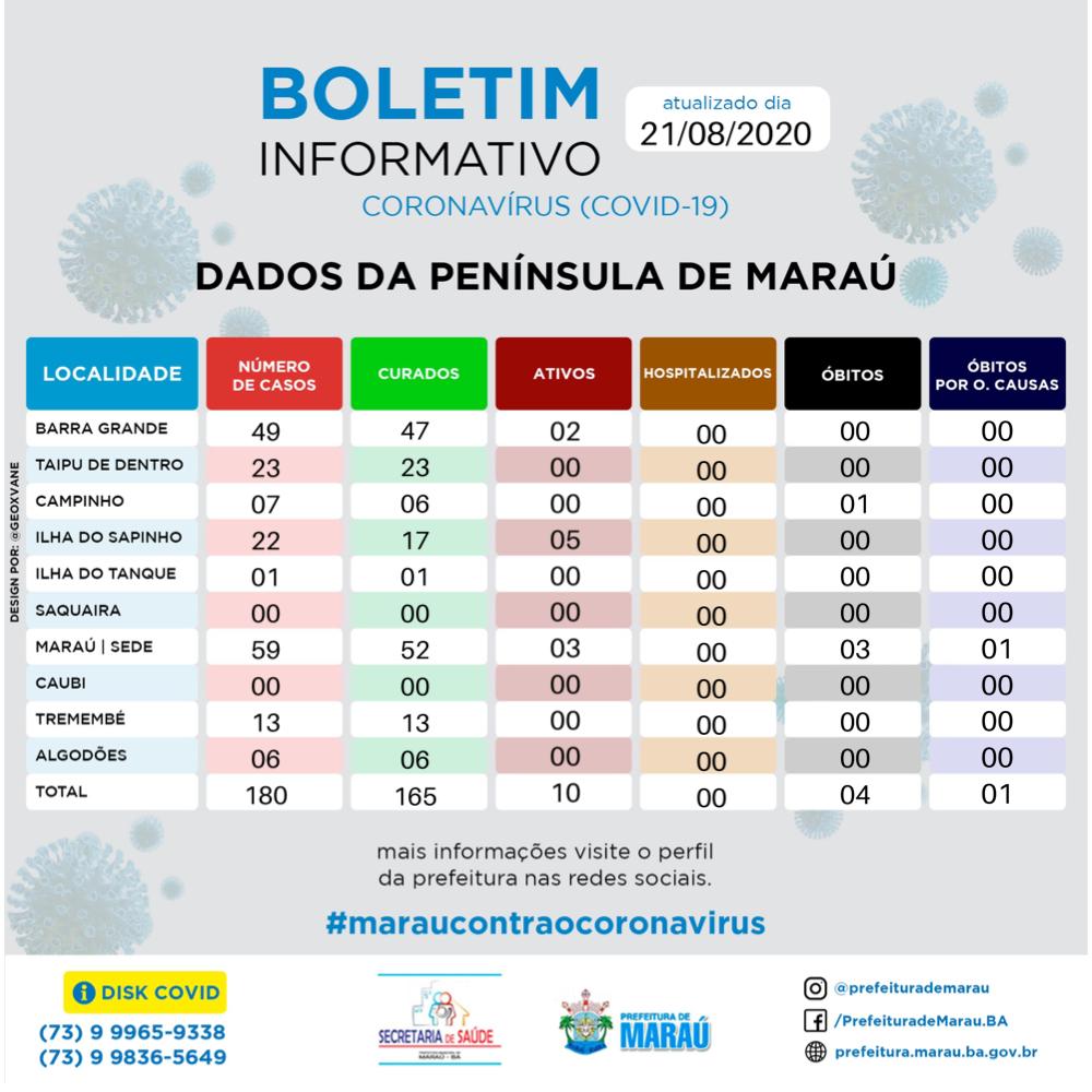 O município de Maraú registrou 04 novos casos da COVID-19, de acordo com o boletim da Secretaria de Saúde. O distrito de Barra Grande tem 1 novo caso e mais 3 na Sede, além de 01 recuperado na Ilha do Sapinho. A Vigilância Epidemiológica registrou 03 casos suspeitos sendo: 01 em Barra Grande, 01 no Sapinho e 01 no Baetés. Outros dois casos suspeitos foram descartados na Sede.