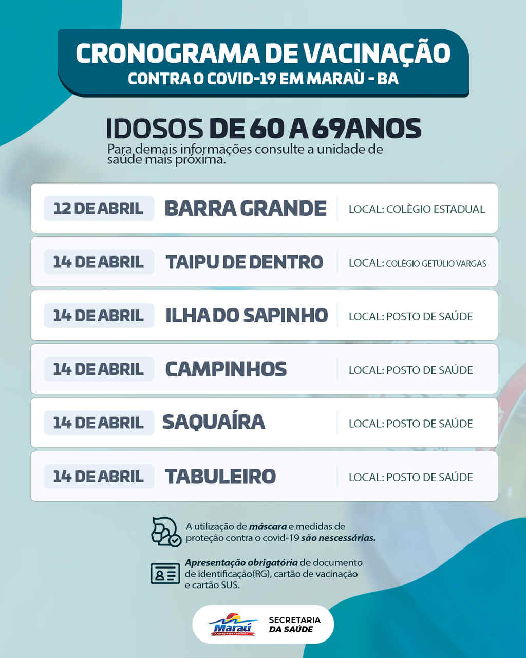 PREFEITURA DE MARAÚ DIVULGA CRONOGRAMA DE VACINAÇÃO CONTRA COVID-19 DESTA SEMANA