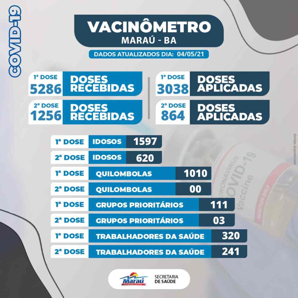 De acordo com o vacinômetro, 320 trabalhadores da saúde já foram imunizados e 241 receberam a segunda dose. Maraú já recebeu para a primeira dose de vacina 5286 doses de imunizantes e 1256 para segunda dose. 111 pessoas que fazem parte do grupo prioritário já foram vacinados com a primeira dose.
