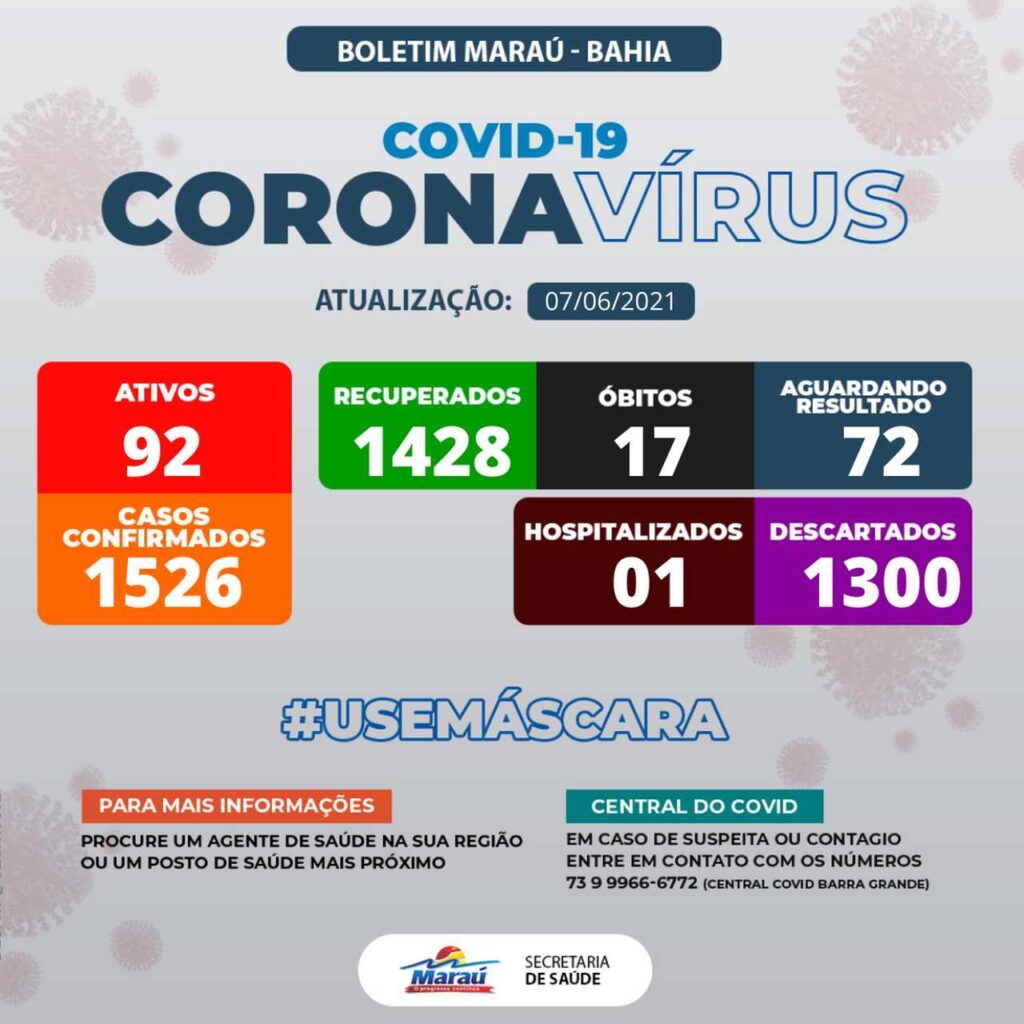 A Secretaria de Saúde de Maraú confirmou nesta segunda-feira, 07 de junho, 92 casos ativos da COVID-19, em todo município. O maior número de infectados segue em Barra Grande, 61 casos ativos, 03 em Saquaíra, 02 em Ibiaçú, 03 em Taipu De Dentro, 04 em Campinho, 04 na Sede, 03 no Tabuleiro, 01 na Ponte do Sul, 08 em Algodões, 02 na Santa Maria e 01 na Gamboa