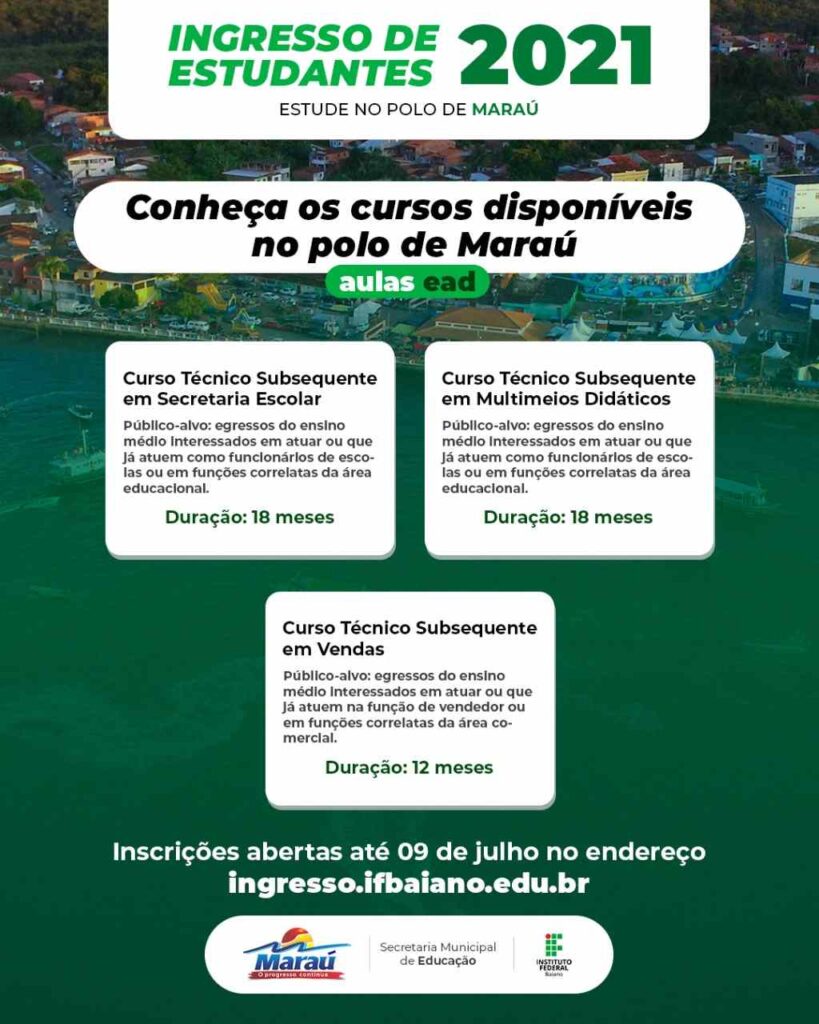 O Instituto Federal Baiano, em parceria com a Secretaria municipal de Educação da Prefeitura de Maraú, abre vagas para cursos técnicos a distância. A parceria foi firmada após reunião com prefeito Manassés Souza e Hozana Ramos, Secretária de Educação com Daniel Carlos – Diretor Geral do IF Baiano (campus Uruçuca) e Joaldo Luz, coordenador de educação a distância do IF Baiano