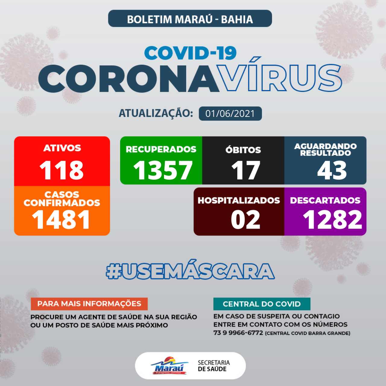 SOBE PARA 118 CASOS ATIVOS DA COVID-19 EM MARAÚ; 80 ATIVOS EM BARRA GRANDE