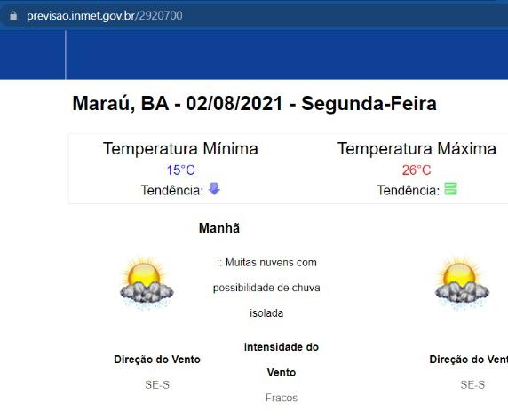 O clima frio permanece estável nesta segunda-feira (02/08), e podem ocorrer chuvas fracas na península de Maraú, segundo a previsão do INMET – Instituto Nacional de Meteorologia. Pela manhã a previsão é de muitas nuvens com possibilidade de chula isolada e ventos fracos. Destaque vem para o frio que deve acontecer até a próxima quinta-feira, 05/08, com temperaturas abaixo dos 20º C. Na segunda, o frio deve chegar a 15º e a máxima de 28º.