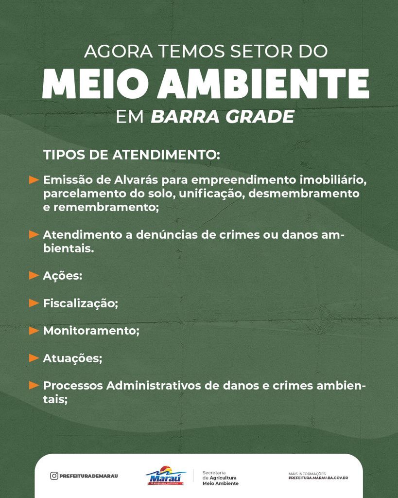 Entre os serviços oferecidos no CIAC estão os relacionados da Secretaria de Meio Ambiente – como processos para licenciamento de obras, anuência ambiental, anuência de gestão da APA para processos junto a Coelba, SPU e Incra, certidão de uso e ocupação de solo, licenciamento para movimentação de terras e canteiros de obra, licença para eventos, emissão de certidões conformidade ambiental, fiscalização, monitoramento, processos administrativos de danos ambientais e crimes ambientais, recebimento de denúncias, emissão de alvarás para empreendimentos imobiliários, parcelamento de solo, unificação, desmembramento e remembramento, entre outros. O e-mail do setor de meio ambiente é o meioambiente@marau.ba.gov.br.