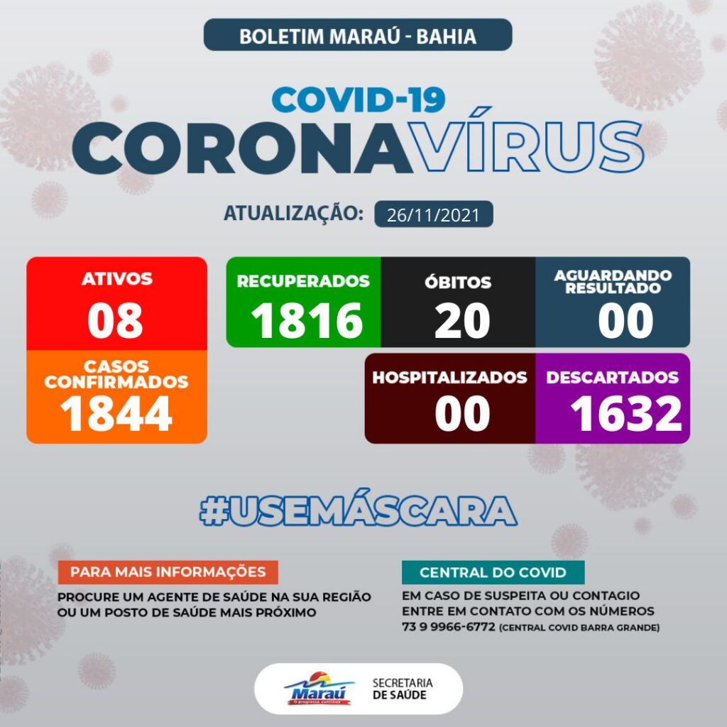 Em boletim divulgado nesta sexta-feira, 26 de novembro, a prefeitura de Maraú, por meio da Secretaria de Saúde comunica que há 08 casos ativos de coronavírus no município, sendo 5 em Ibiaçú e 3 no Tabuleiro. Foram descartados 11 casos suspeitos em Barra Grande e 01 paciente que estava com a doença está recuperado.
