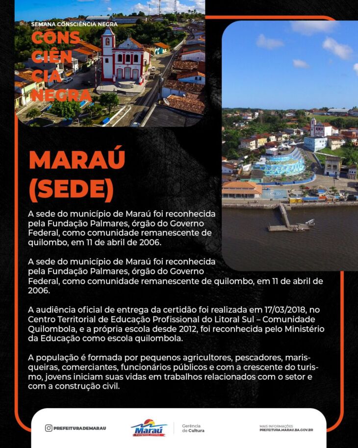 Como parte da programação da semana da consciência negra no município de Maraú, a Prefeitura traz hoje um pouco sobre a Sede de Maraú que é reconhecido pela fundação Palmares, como comunidade de remanescente de quilombo.