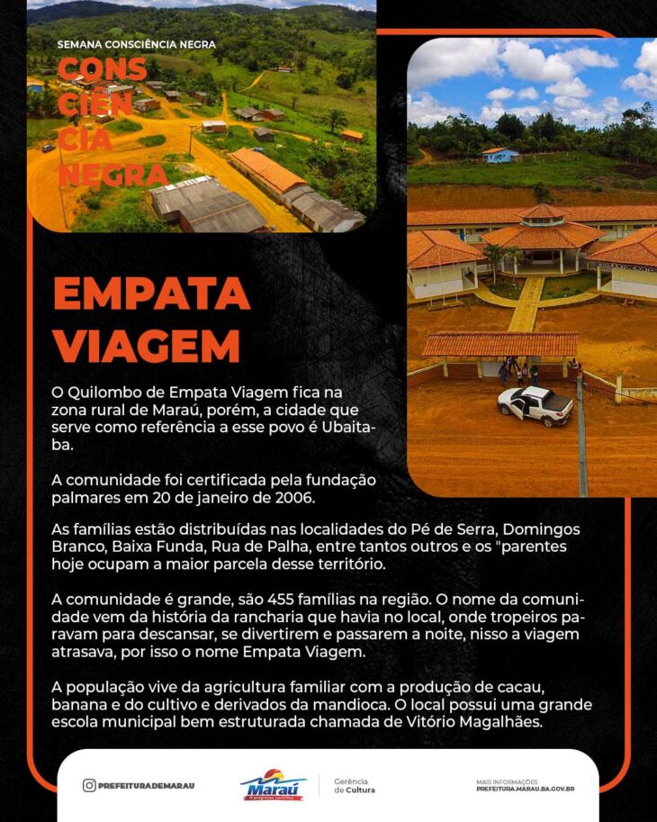 No último dia 20 de novembro foi comemorado o “Dia Nacional da Consciência Negra” em homenagem ao herói nacional negro Zumbi assassinado em 1695. Escravo, foi líder do Quilombo dos Palmares, em Alagoas. E a Prefeitura De Maraú divulgou nos últimos dias, um pouco sobre cinco comunidades certificadas como remanescente de quilombo pela fundação palmares. Hoje, vocês irão conhecer um pouco da 6º e última comunidade quilombola do município, a região do Empata Viagem.