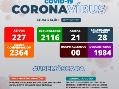 Em boletim divulgado nesta segunda-feira, 07 de fevereiro, a prefeitura de Maraú, por meio da Secretaria de Saúde comunica que há 227 casos ...