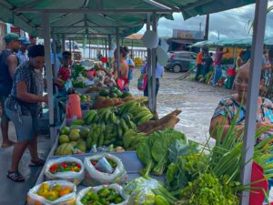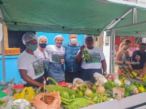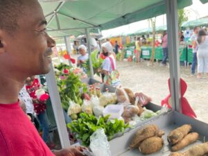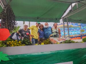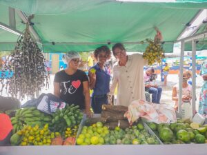 O prefeito Manassés acompanhado da primeira-dama, Rose Moreno e do secretário de Agricultura, Mica, prestigiaram a feira da agricultura familiar.