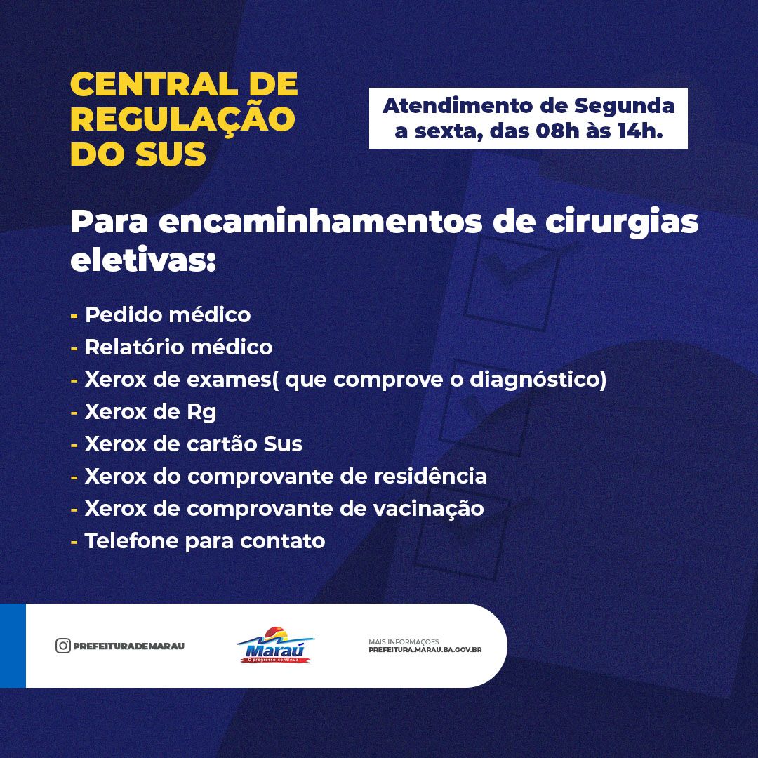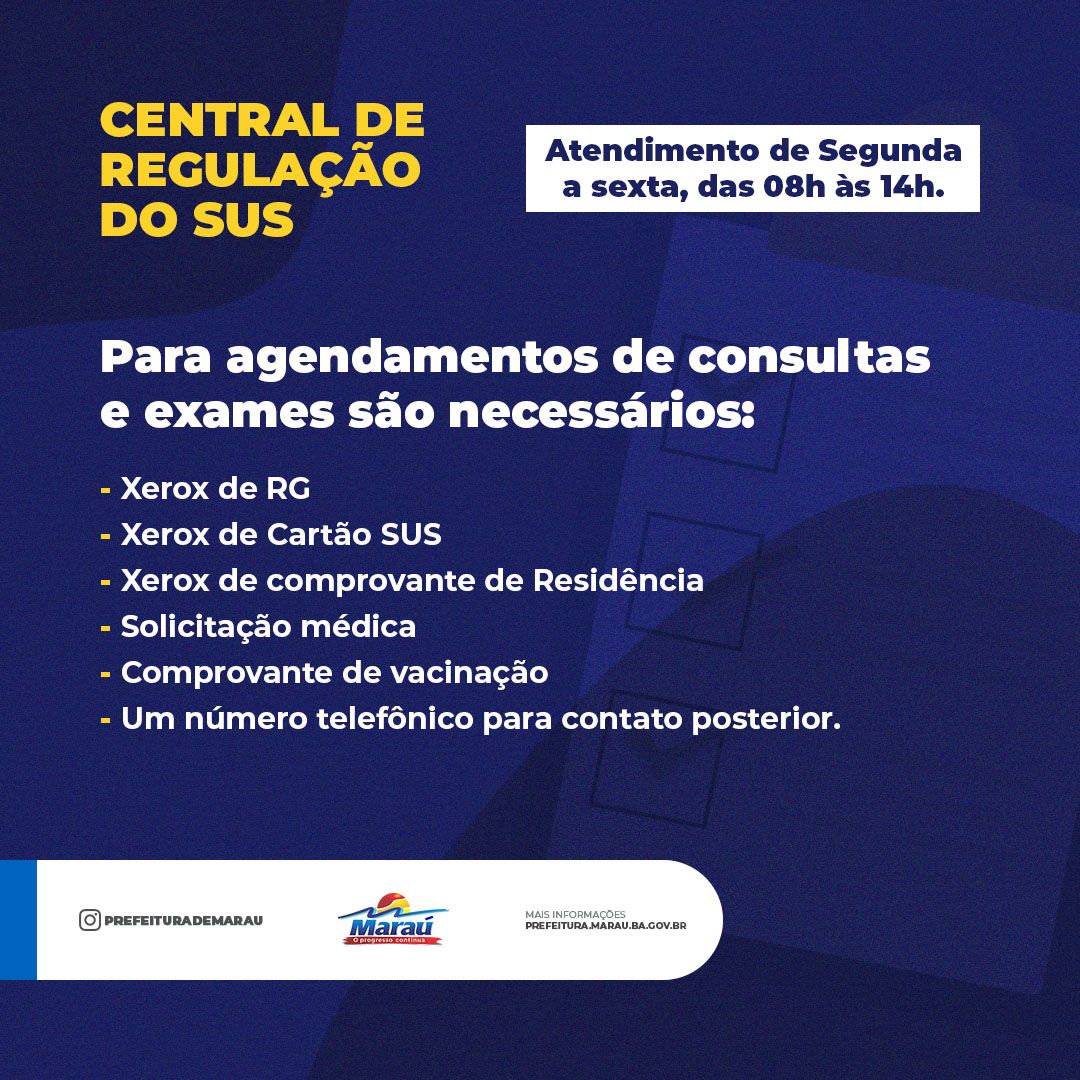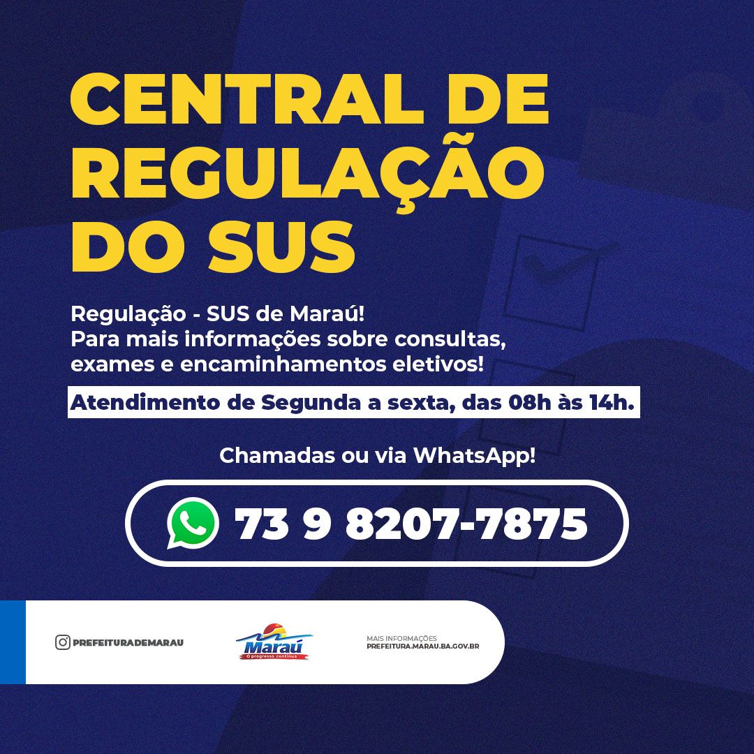 Maraú CENTRAL DE REGULAÇÃO DO SUS EM MARAÚ AGORA TEM ATENDIMENTO PELO WHAT’SAPP By Darlim 31 de maio de 2022 CompartilharTwitar 0 O Governo Municipal, através da Secretaria de Saúde, informa que a Central de Regulação do SUS em Maraú, agora conta com um canal exclusivo para atendimento. Basta ligar no número (73) 9 8207-7875 para agendar consultas e ou exames.