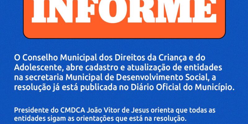 O Conselho Municipal dos Direitos da Criança e do Adolescente, abre cadastro e atualização de entidades na Secretaria Municipal de Desenvolvimento Social, a resolução já está publicada no Diário Oficial do Município.Resolução
