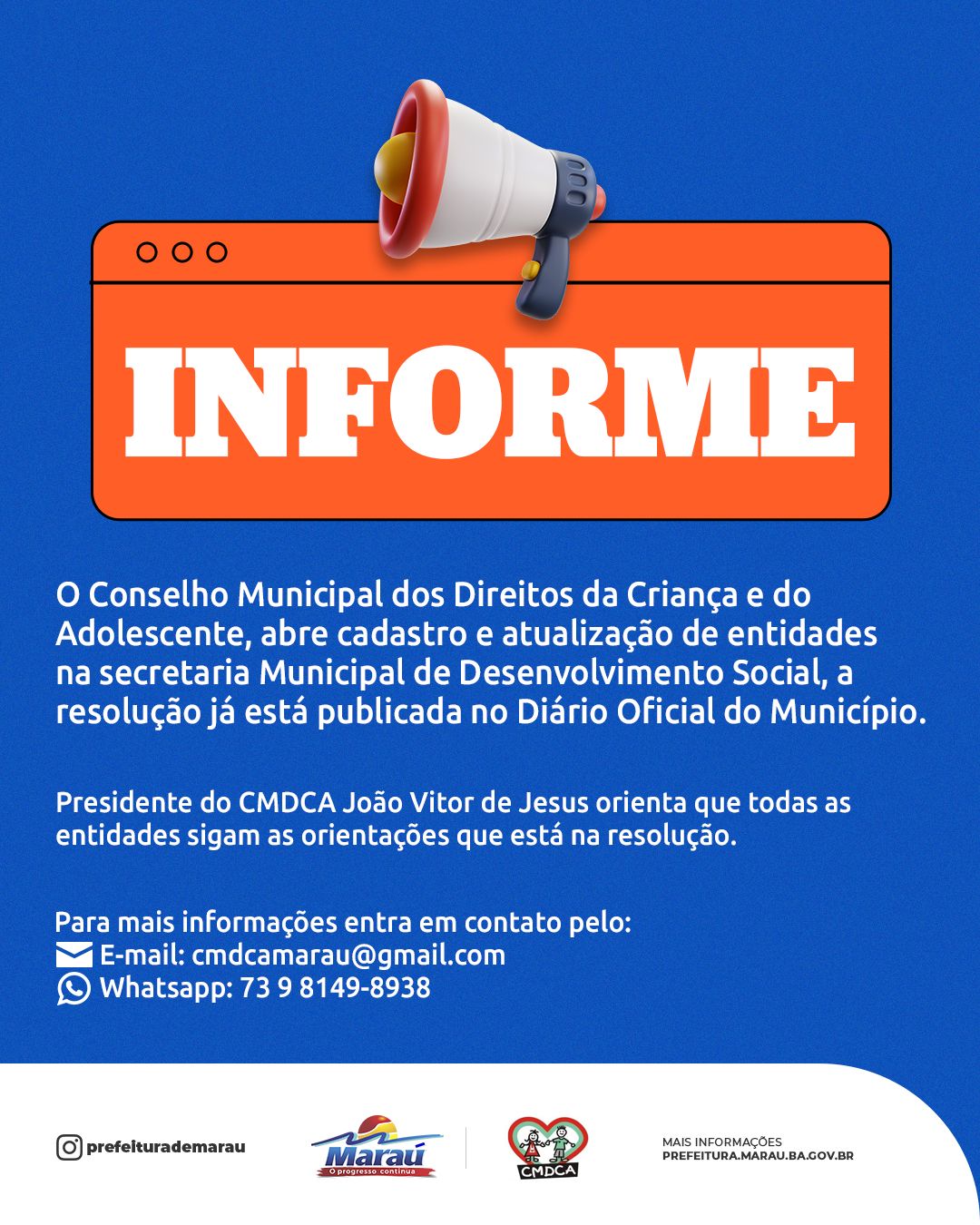 Presidente do CMDCA, João Vitor de Jesus, orienta que todas as entidades sigam as orientações que está na resolução. Para mais informações entra em contato pelo e-mail: cmdcamarau@gmail.com ou whatsapp: 73 98149-8938.