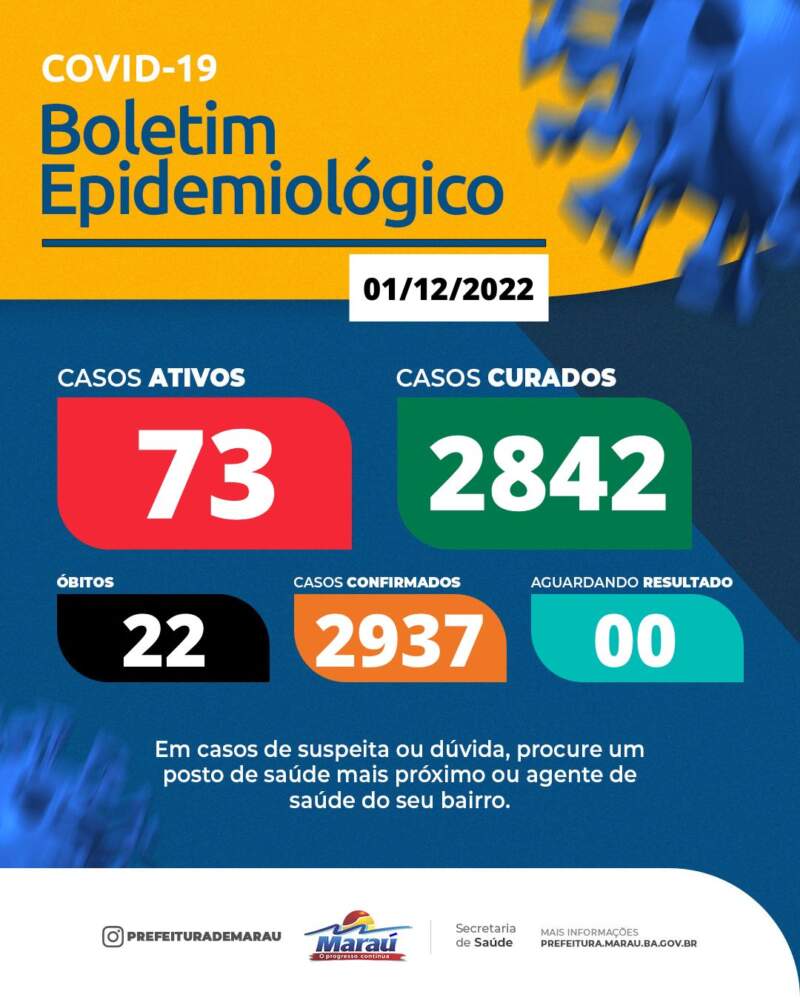 Em boletim divulgado nesta quinta-feira, 01 de dezembro, a prefeitura de Maraú, por meio da Secretaria de Saúde comunica que há 73 casos ativos de coronavírus no município, sendo 42 casos em Barra Grande, 13 na Sede, 01 em Ibiaçú, 05 em Saquaíra, 03 em Tremembé, 07 no Tabuleiro, 01 no Saleiro e 01 no São Raimundo.