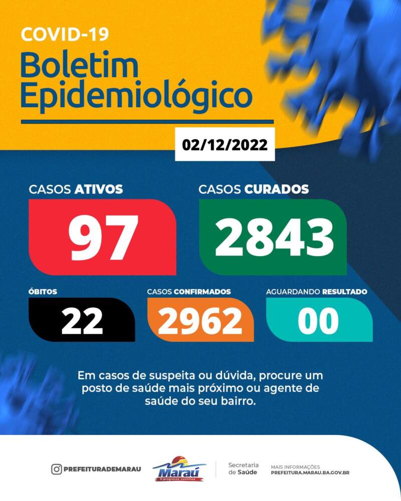 Em boletim divulgado nesta sexta-feira, 02 de dezembro, a prefeitura de Maraú, por meio da Secretaria de Saúde comunica que há 97 casos ativos de coronavírus no município, sendo 55 casos em Barra Grande, 17 na Sede, 02 em Ibiaçú, 05 em Saquaíra, 03 em Tremembé, 08 no Tabuleiro, 02 no Saleiro, 01 no São Raimundo, 01 no Cassange, 01 em Algodões e 01 Piabanha.