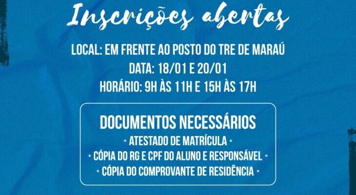A De Peito Aberto realizará nos próximos dias 18 (quarta-feira) e 20 (sexta-feira) de janeiro as inscrições para o Projeto Oportunidade Através do Esporte, em Maraú (BA). Os interessados devem comparecer em frente ao posto do TRE de Maraú de 9h às 11h ou de 15h às 17h.