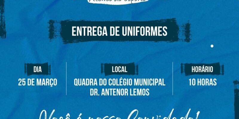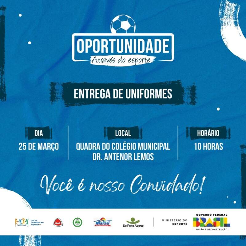 A De Peito Aberto realizará no sábado, dia 25, às 10h, na Quadra do Colégio Municipal Doutor Lemos, a distribuição dos kits de fardamentos para os alunos do Projeto Oportunidade Através do Esporte. Os beneficiários ganharão camisa, short, meião, caneleira e calçado para utilização nas aulas de futsal. Todo o material será entregue de forma gratuita para os 50 alunos matriculados na iniciativa.