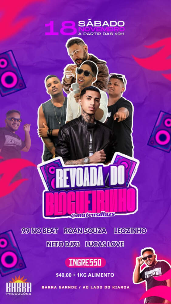 O sábado, 18 de novembro vai ser agitado em Barra Grande, na Península de Maraú com a realização da “Revoada do Blogueirinho” promovido pelo influenciador Mateus Diazs, em parceria com a Barra Produções, Davi Dias, Jefersontour, Roan Souza e Glaubinho Locações.
