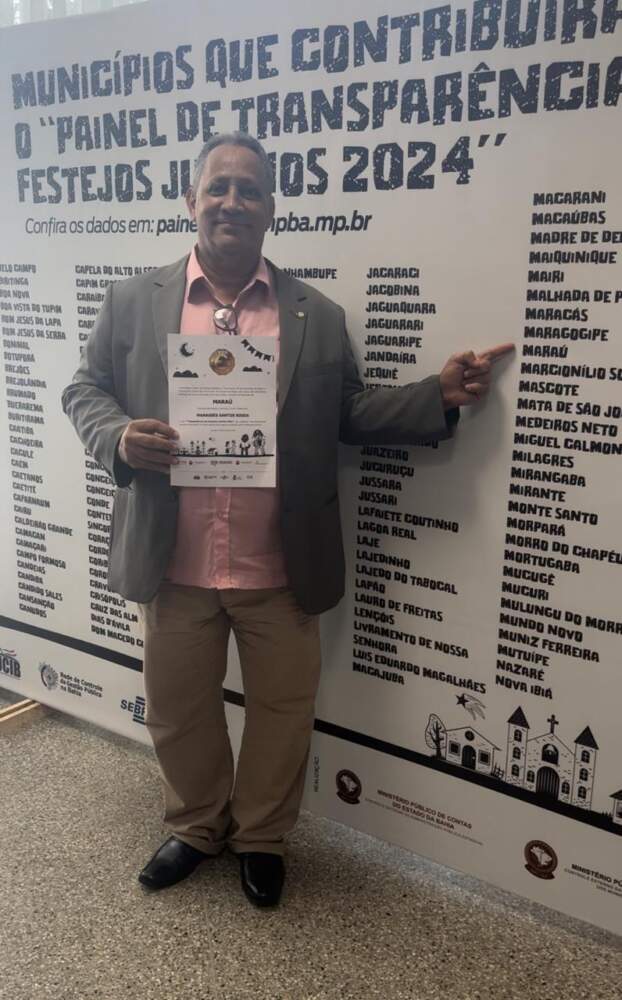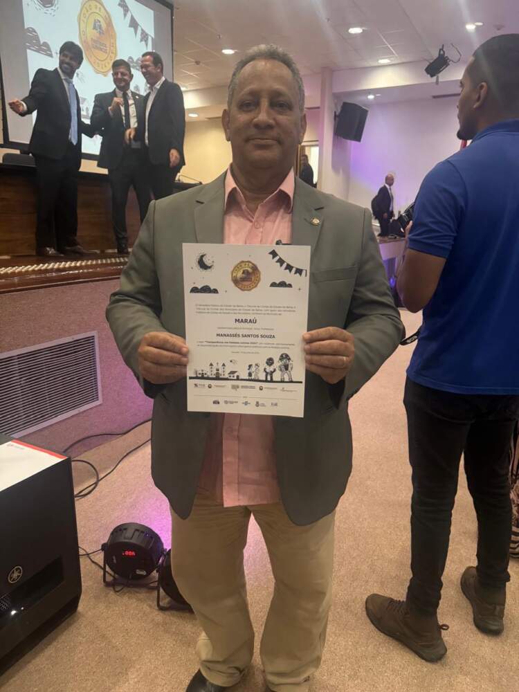 O prefeito de Maraú, Manassés Souza (Avante), foi um dos 328 gestores municipais do interior da Bahia que foram reconhecidos pelo Ministério Público da Bahia (MP-BA) com o “Selo de Transparência” devido à gestão dos recursos para festas juninas. O evento de premiação ocorreu na manhã desta quinta-feira, 13 e contou com a presença do Procurador Geral da Bahia, Pedro Maia, Presidente do Tribunal de Contas da Bahia, Marcos Presídio, a promotora do Ministério Público da Bahia (MP-BA), Rita Tourinho e o presidente da UPB, Quinho.