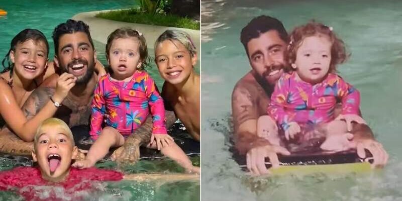 “Meus peixinhos”, brincou o ex-BBB, que tem a companhia de Cintia na viagem. Na piscina, Scooby “ensinou” Aurora a pegar onda com uma prancha de bodyboarding. “Amor, você está na água”, se derreteu a modelo.