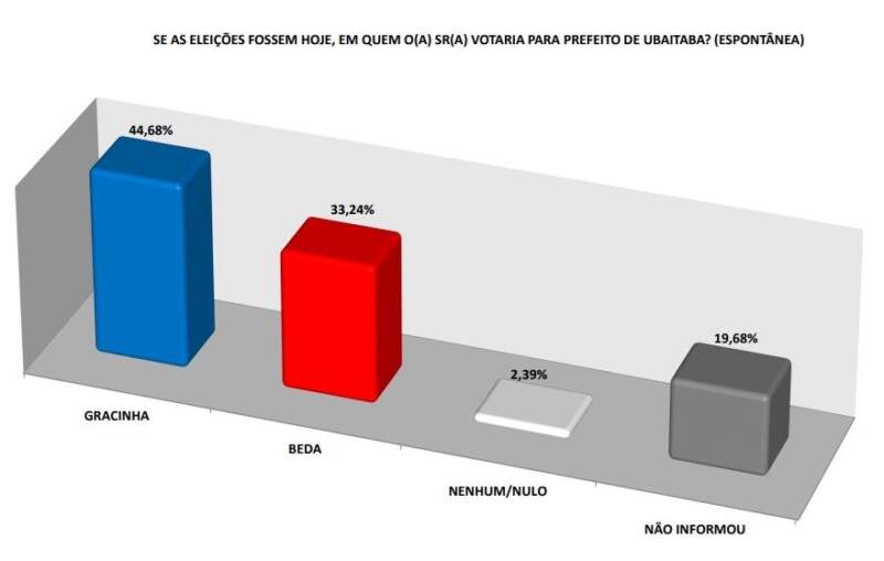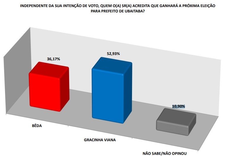 Quando os eleitores foram perguntados sobre quem acreditam que deve vencer as eleições, independentemente de suas intenções de voto, 52,93% afirmaram que Gracinha Viana deve ser a próxima prefeita de Ubaitaba. Em comparação, apenas 36,17% apostam na vitória de Bêda, refletindo a confiança da população na candidata da oposição.