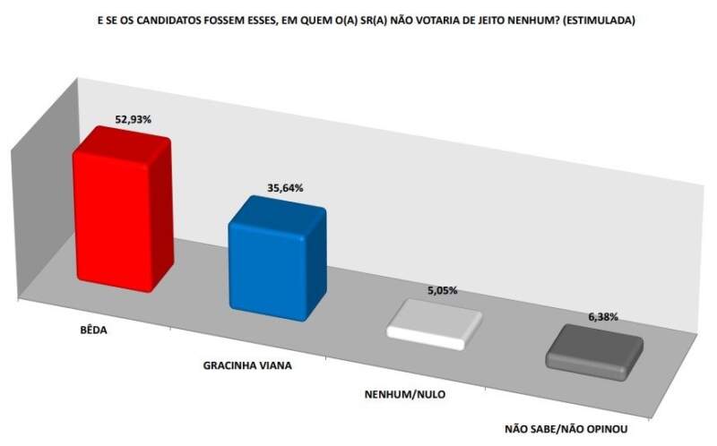 Os dados da pesquisa também mostram uma alta rejeição ao atual prefeito. Quando questionados sobre em quem “não votariam de jeito nenhum”, 52,93% dos eleitores apontaram Bêda como a opção rejeitada.