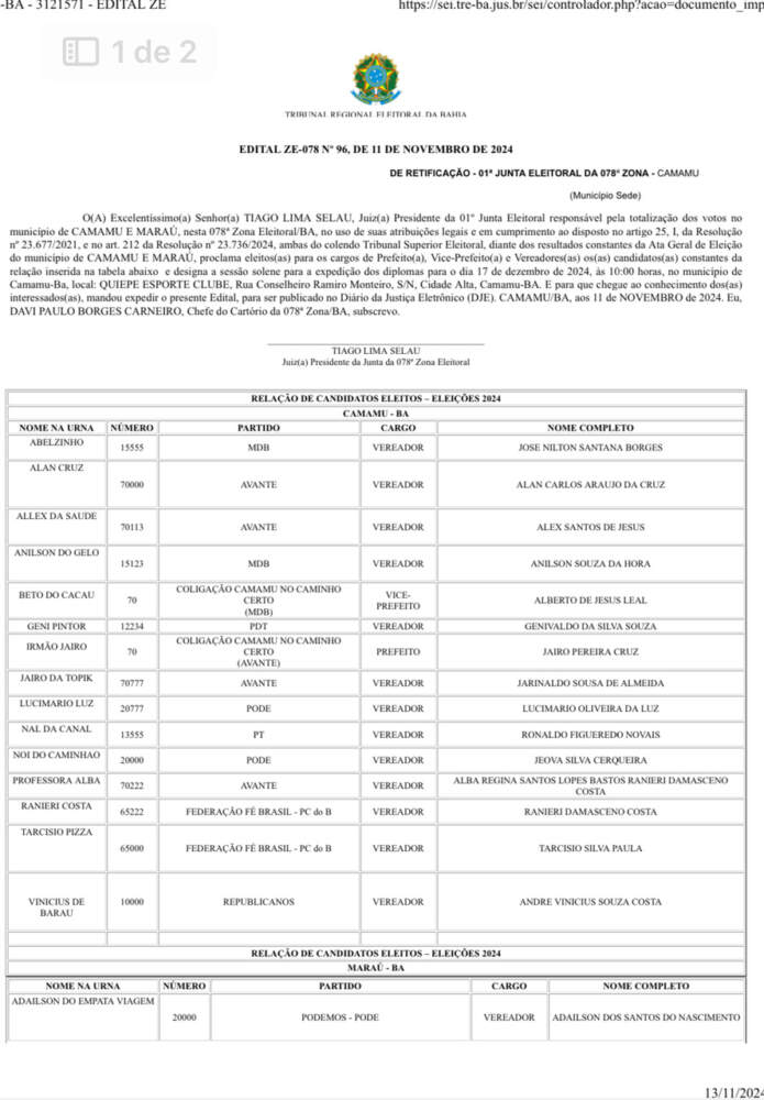 A diplomação dos candidatos eleitos nas Eleições 2024 para os municípios de Maraú e Camamu será realizada no dia 17 de dezembro. A cerimônia terá início às 10 horas no QUIEPE ESPORTE CLUBE, Rua Conselheiro Ramiro Monteiro, S/N, Cidade Alta, Camamu-BA.