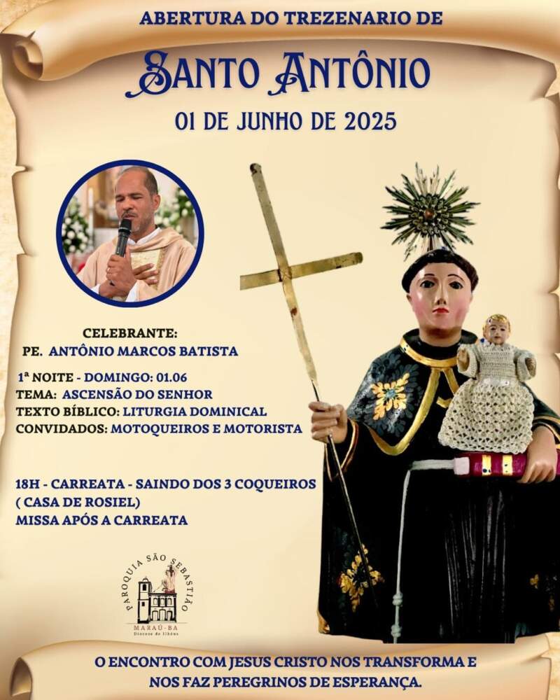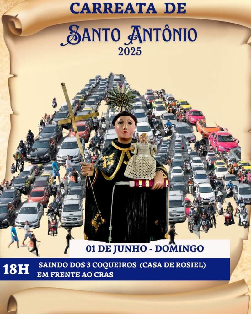 A noite começa às 18h com a Carreata de Santo Antônio, saindo dos 3 Coqueiros (em frente ao CRAS, na casa de Rosiel). O cortejo reunirá fiéis, motoristas e motociclistas em um ato público de fé pelas ruas da vila. Em seguida, será celebrada a Santa Missa pelo padre Antônio Marcos Batista, dando início ao ciclo de treze dias de orações, missas e homenagens ao padroeiro.