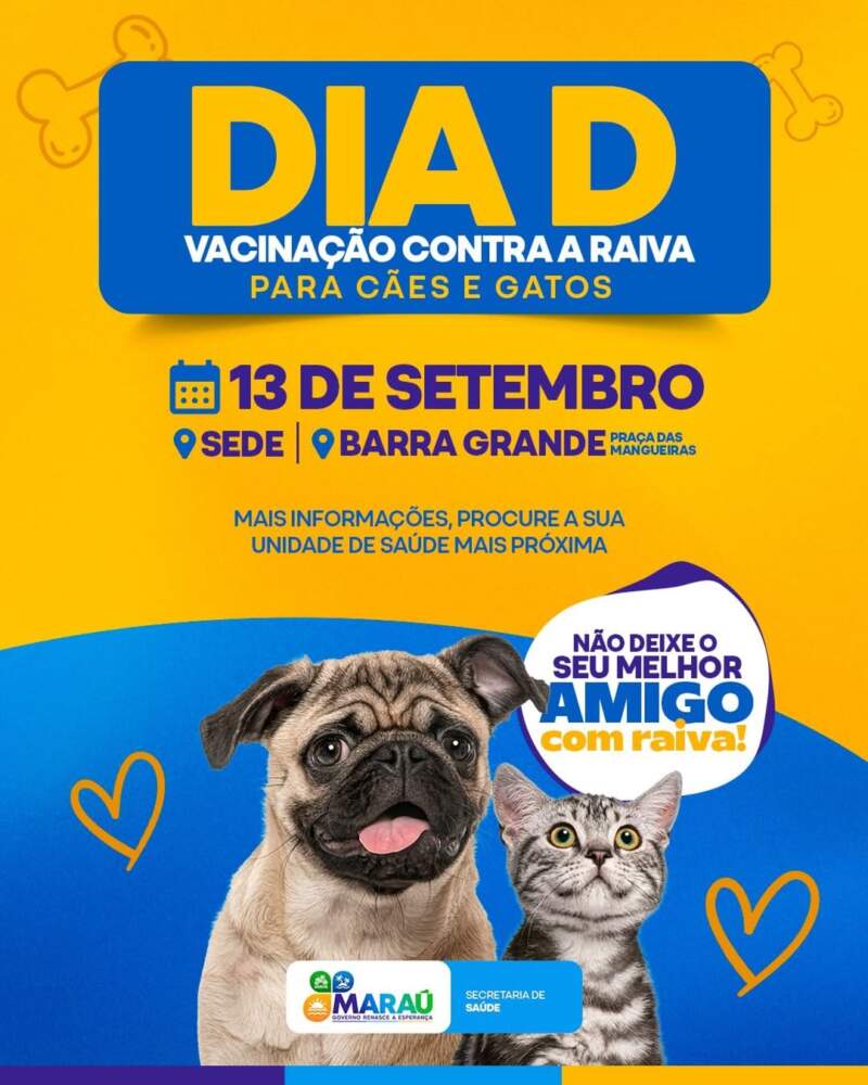 No próximo dia 13 de setembro, acontece em Maraú o Dia D de Vacinação contra a Raiva para cães e gatos. A ação vai acontecer em dois pontos principais: Sede de Maraú e Barra Grande (Praça das Mangueiras), oferecendo de forma gratuita a imunização dos pets contra a raiva, uma doença grave que pode afetar animais e seres humanos.